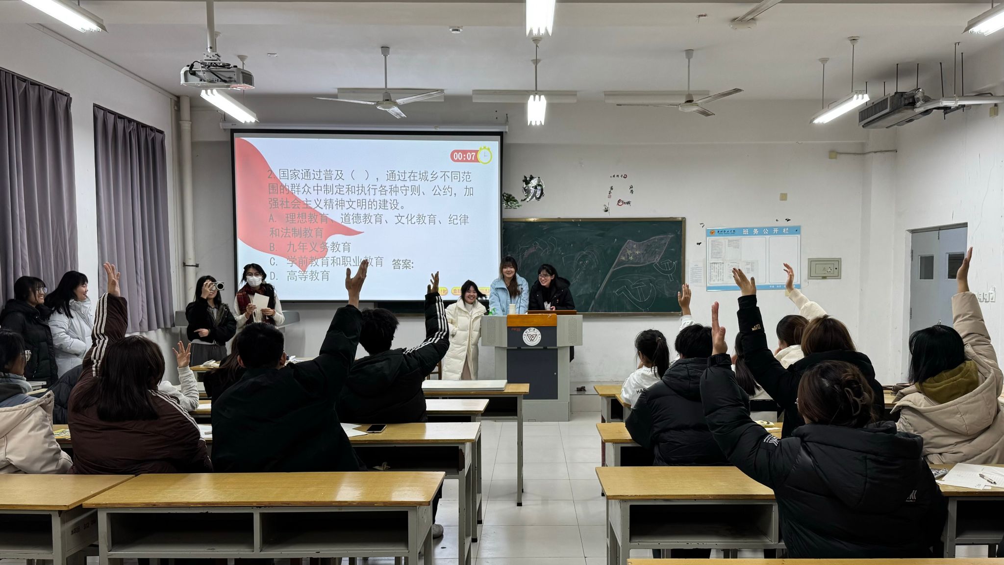 为弘扬宪法精神,培养农林学子的法治观念,提高法治素养,农林科技学院于12月3日至8日晚开展“弘扬宪法精神 共建法治校园”宪法知识竞赛。前期,经过严密组织筹划,农林科技学院参赛同学利用晚自习时间认真学习宪法相关知识,并通过线上答题初赛选拔出5个小组参加线下决赛。决赛分为手机答题和现场抢答两个部分,竞赛题目从宪法的作用、意义和内容等多方面,考察同学们对宪法基本知识的掌握情况。竞赛过程中,选手们严守纪律、积极作答,...更多 -