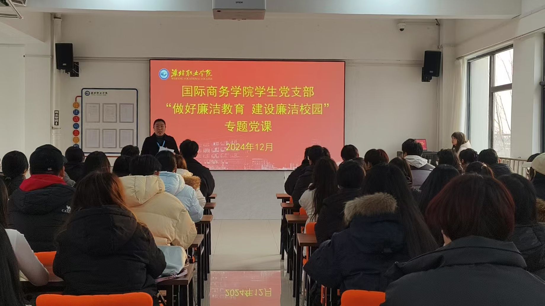 为发挥学院“一站式”学生社区功能型党支部育人功能,推动“清廉校园”建设,12月12日下午,蕙兰社区开展廉洁文化主题党课活动,国际商务学院学生党支部负责同志面向学生预备党员和入党积极分子代表授课。党课围绕“做好廉洁教育 建设廉洁校园”主题展开,主讲人通过“清廉潍坊”发布的《以清风为笔 写文脉绵延》短视频让学生们了解廉脉在潍坊这片热土上的诞生与流传,引发学生们对新时代廉洁文化建设的思考。主讲人图文并茂讲述了廉洁文化相关的人、...更多 -