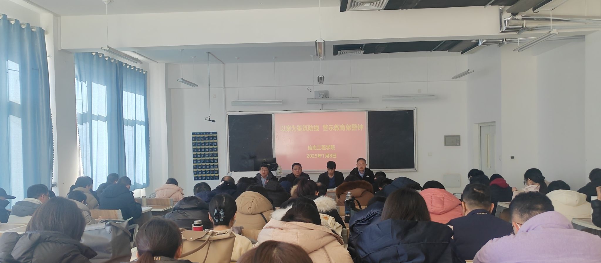 为切实筑牢全体教职工廉洁自律防线,弘扬清风正气,营造清正廉洁的节日氛围,1月8日,信息工程学院在智泽1号楼A215组织开展“以案为鉴筑防线 警示教育敲警钟”为主题的警示教育活动,全体教职工参加。信息工程学院党总支负责同志宣读了《警示教育案例汇编》(2025年第1期)中的违反中央八项规定精神典型案例及相关纪法知识,深刻剖析了案件发生的原因和背后反映出的问题,给全体人员敲响了警钟。他强调,案例是最好的教科书,也是最好的警示镜。...更多 -